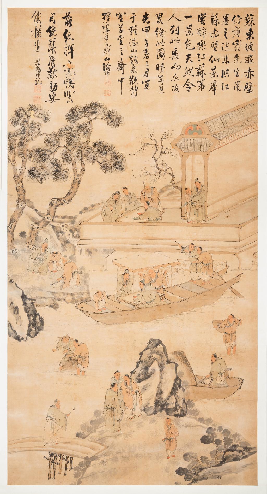 “东坡游赤壁”是中国山水人物画的传统主题,这幅画艺术地再现了苏轼前后《赤壁赋》的意境。画面中:水面上的游船及船上的人物都画得清晰、醒目,中间的人身形稍大,其他人正在看着他发议论,以此表明他是主角苏东坡。明清之际,战乱频发,人们更加追求逍遥自在的生活,因此出现了许多《东坡赤壁图》,这种题材背后反映的是一种厌战反战、民心思安的心理需求。