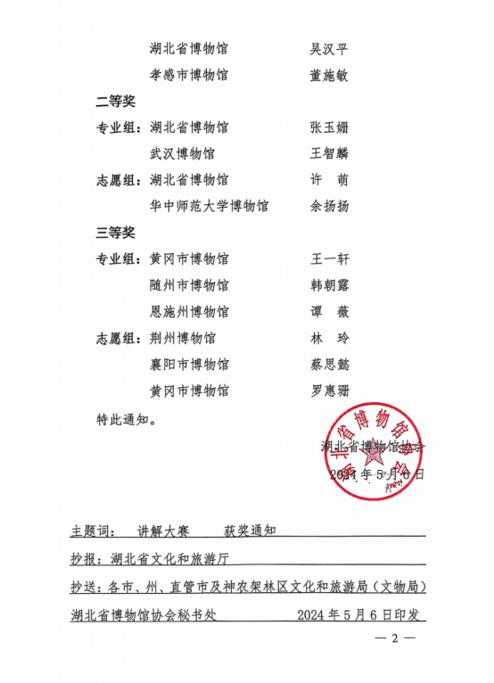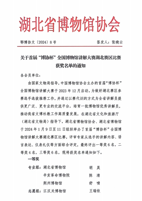 2024年1月10日,在省文化和旅游厅的指导下,湖北省博物馆协会组织的首届“博协杯”全国博物馆讲解大赛湖北赛区初赛线下比赛在湖北省博物馆举办,初赛从全省五十余家博物馆中选拔出专业组、志愿者组各八名参加省决赛,五位专业评委从讲解内容,讲解技巧,精神风貌,时间控制四个方面,选拔出各三位选手参加首届“博协杯”全国博物馆讲解大赛。