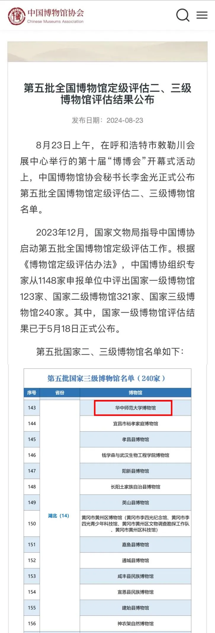 (通讯员 王怡文)8月23日上午,第十届中国博物馆及相关产品与技术博览会在呼和浩特市举办,中国博物馆协会秘书长李金光正式公布了第五批国家二、三级博物馆名单。首次参评的华中师范大学博物馆被评为国家三级博物馆。