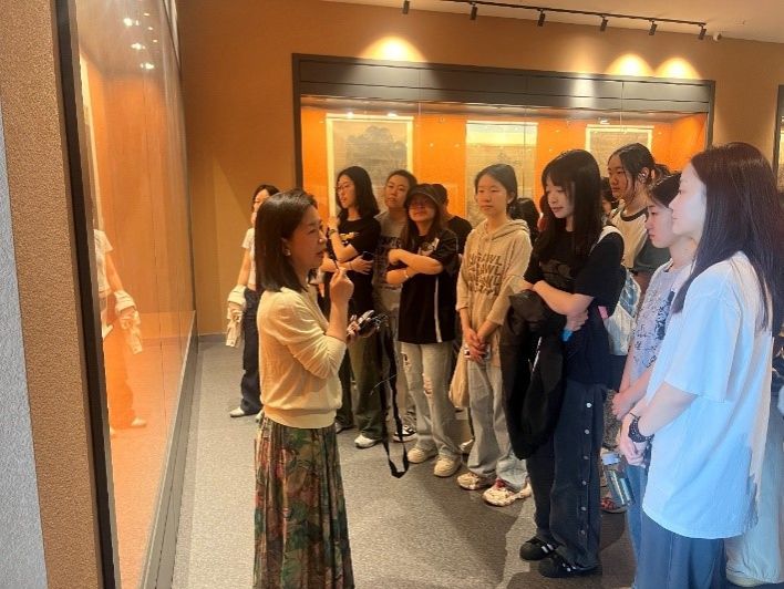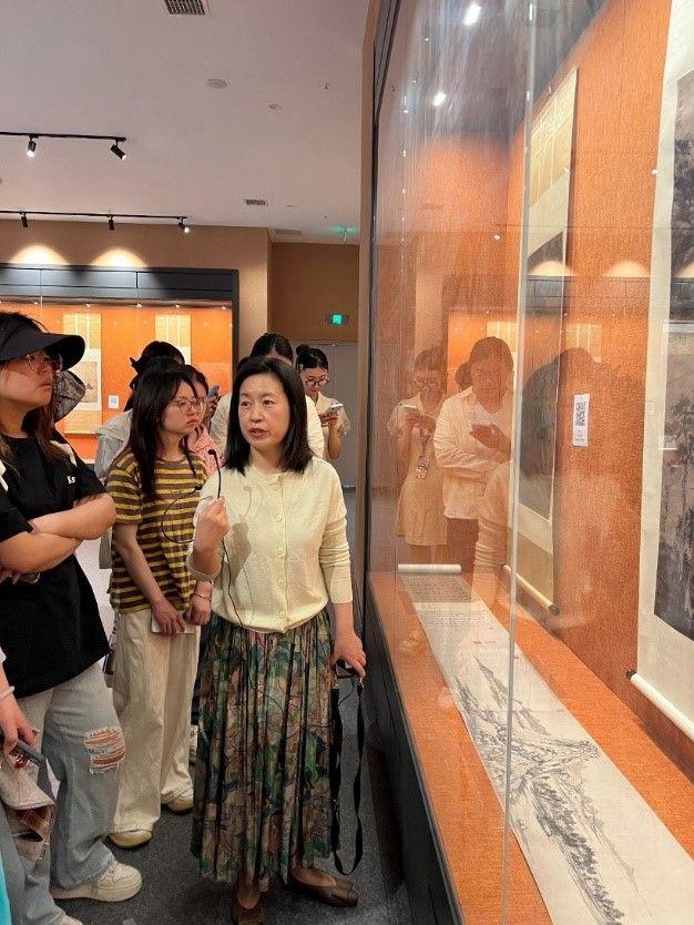 课堂以传世名画复制品为载体,通过作品赏析、文化解读、学习建议三方面搭建传统艺术与现代学术的对话平台。课堂上,李老师带领同学们赏析临展各画,就不同画作进行分析,并指出其对应精妙之处。通过一系列名画赏析,在场同学体会到传统国画中蕴含的精深技艺。在讲解过程中,李老师还向同学们揭示了传统国画中丰富的文化寓意与用笔技巧,强调“干湿浓淡、提按转折”中蕴含的灵动与生命。课堂最后,李果老师还向同学们提出宝贵建议:在今后学习过程中,多向名作取法,既要多看也要多练,在不断临摹的过程中找到属于自己的笔法。