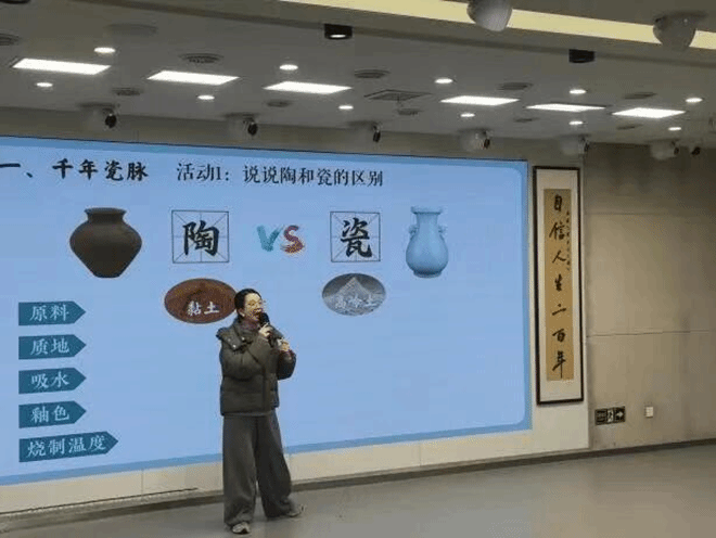 在“千年瓷脉”环节,通过实物触摸体验与互动问答等形式,同学们直观感受了瓷器与陶器在质地方面的差异,系统掌握了二者在原料选取、质地特性、釉色呈现及烧制温度等方面的区别。