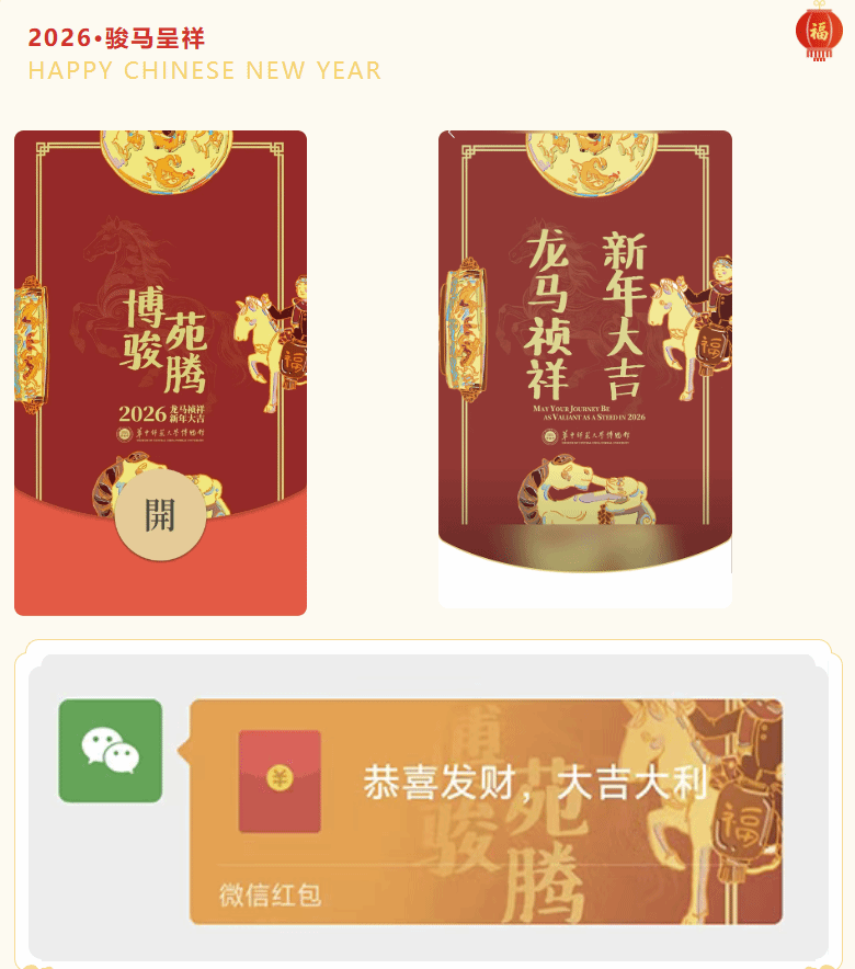 迎新春,骏马启新程。让这承载着华师博物馆文化温度的红包封面,成为你新春传递祝福的独特信物,愿我们一同伴着文物的古韵,在马年的征程中,收获满满、顺遂常安!